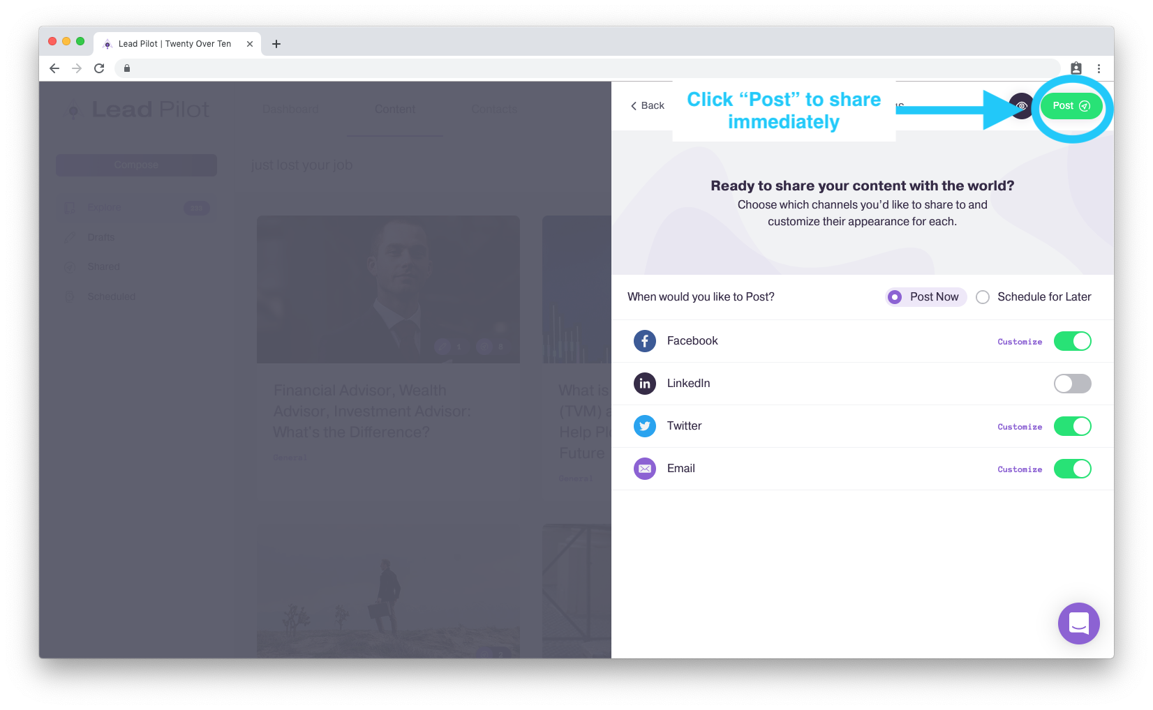 يجعل Lead Pilot جدولة المحتوى الخاص بك ونشره على وسائل التواصل الاجتماعي أمرًا سهلاً. إليك الطريقة:
