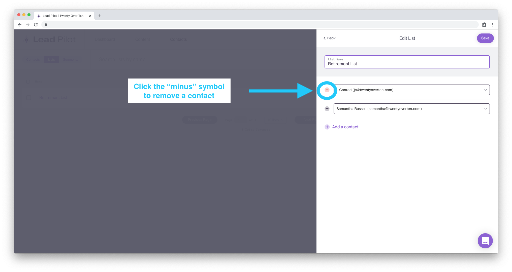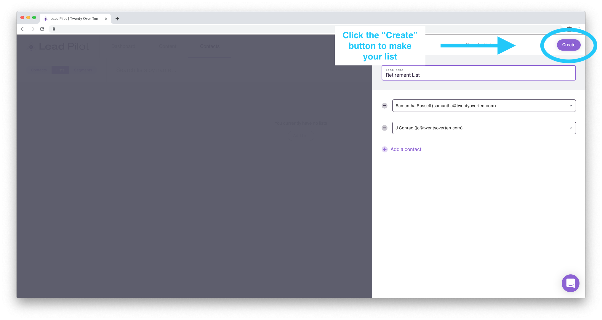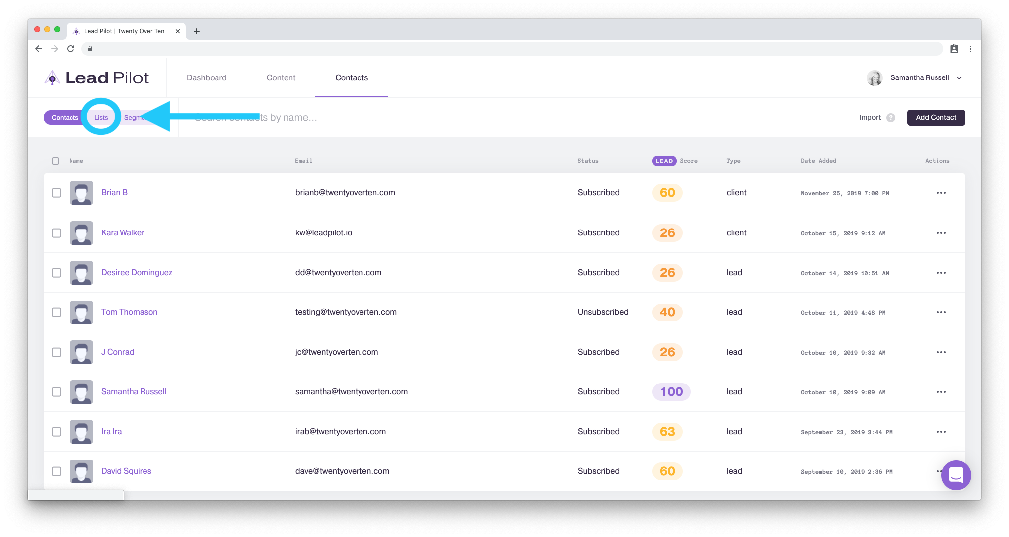 يجعل برنامج Twenty Over Ten's Lead Pilot تخصيص قوائم البريد الإلكتروني وتنظيمها أمرًا بسيطًا وسهلاً. إليك الطريقة: