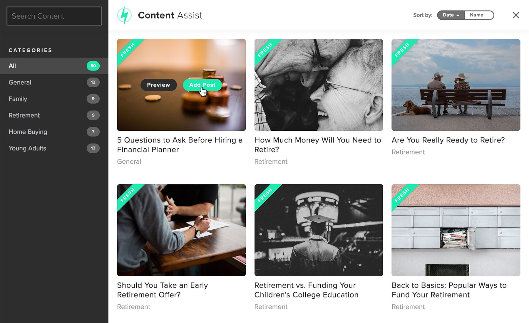 إذا كان لا يزال يبدو أنك لا تستطيع التعامل مع مدونة بمفردك ، فنحن هنا لمساعدتك! يمكن أن تساعدك خدمتنا ، Content Assist ، على تشغيل وإدارة تسويق المحتوى بشكل فعال لشركة التخطيط المالي الخاصة بك في مكان واحد. يمنحك Content Assist طريقة أسهل لنشر منشورات مدونة فريدة مصممة خصيصًا لصوت شركتك والتي تتحدث عن مكانتك الفريدة. إذا لم يكن لديك الوقت الكافي للالتزام الكامل بالتدوين ولكنك لا تزال ترغب في جعله أحد أهدافك لعام 2019 ، فتعرف على المزيد حول Content Assist هنا!