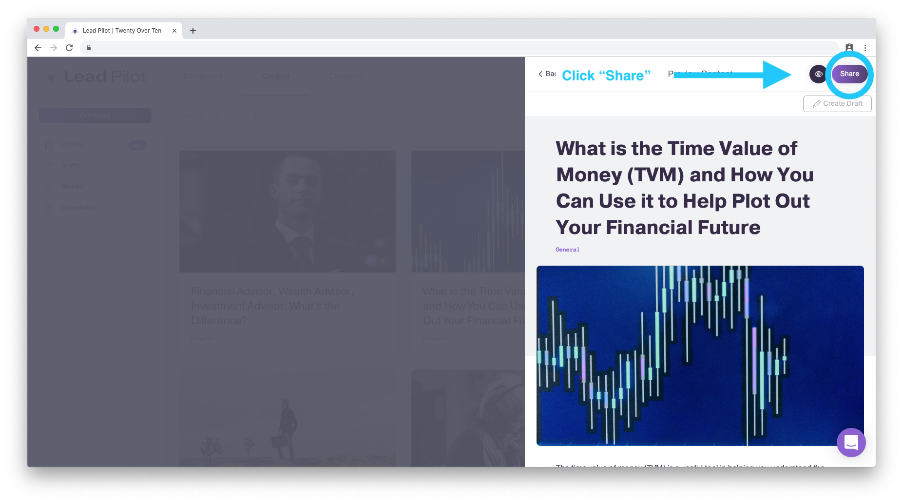 1. بمجرد الانتهاء من إنشاء المنشور الخاص بك أو تحديد شيء ما من "استكشاف مكتبة المحتوى" للتخصيص ، انقر فوق الزر "مشاركة" أعلى النافذة الجانبية "تحرير المسودة" أو "معاينة المحتوى" :