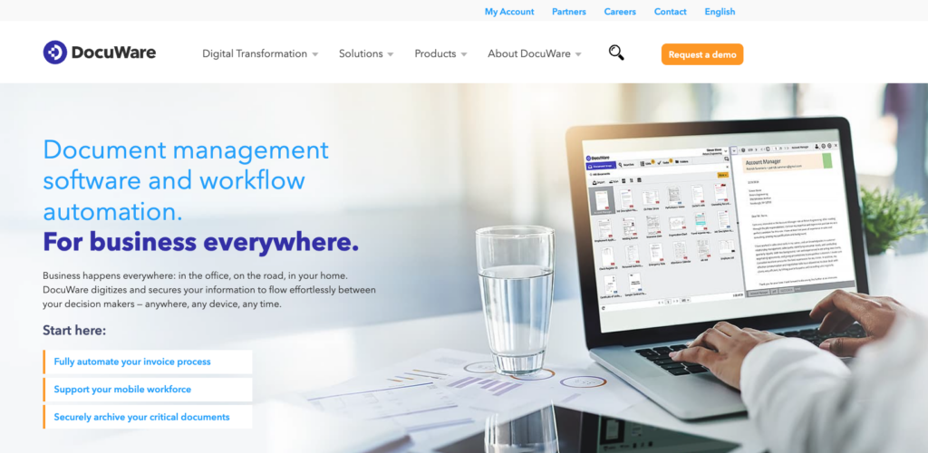 DocuWare هو نظام آلي لإدارة المستندات مزود بأدوات لإعداد الفواتير والتوقيعات الإلكترونية. يمكن لأصحاب العمل استخدام لوحة معلومات الإدارة المركزية لتنظيم الملفات. يتم تشفير جميع المعلومات المخزنة وحمايتها باستخدام ممارسات الأمان الأخرى ، وهناك بعض عمليات التكامل الخاصة بجهات خارجية.