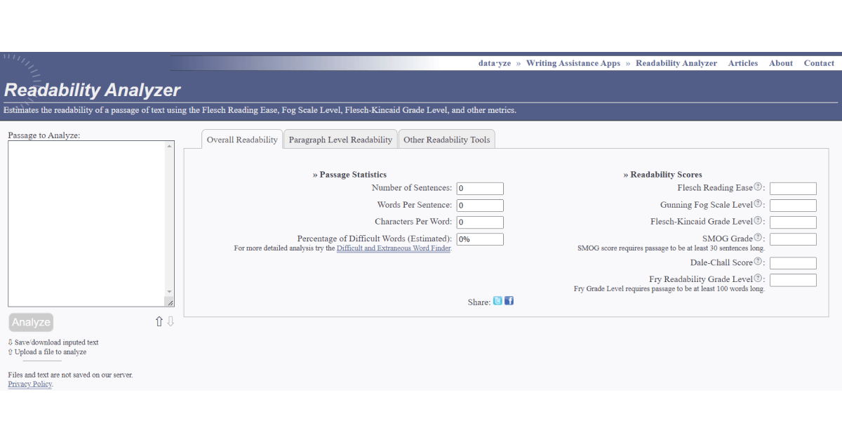 بمجرد إدخال النص الخاص بك ، سيوفر إحصائيات قابلية القراءة والنتائج من اختبارات Flesh-Kincaid و Gunning Fog و SMOG و Dale-Chall و Fry .