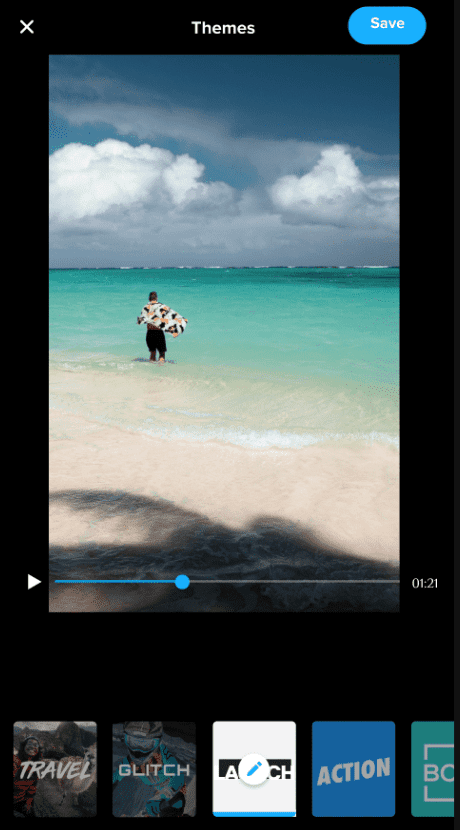 - يتيح لك قص المقاطع وإضافة الصور ومقاطع الفيديو والمرشحات والانتقالات