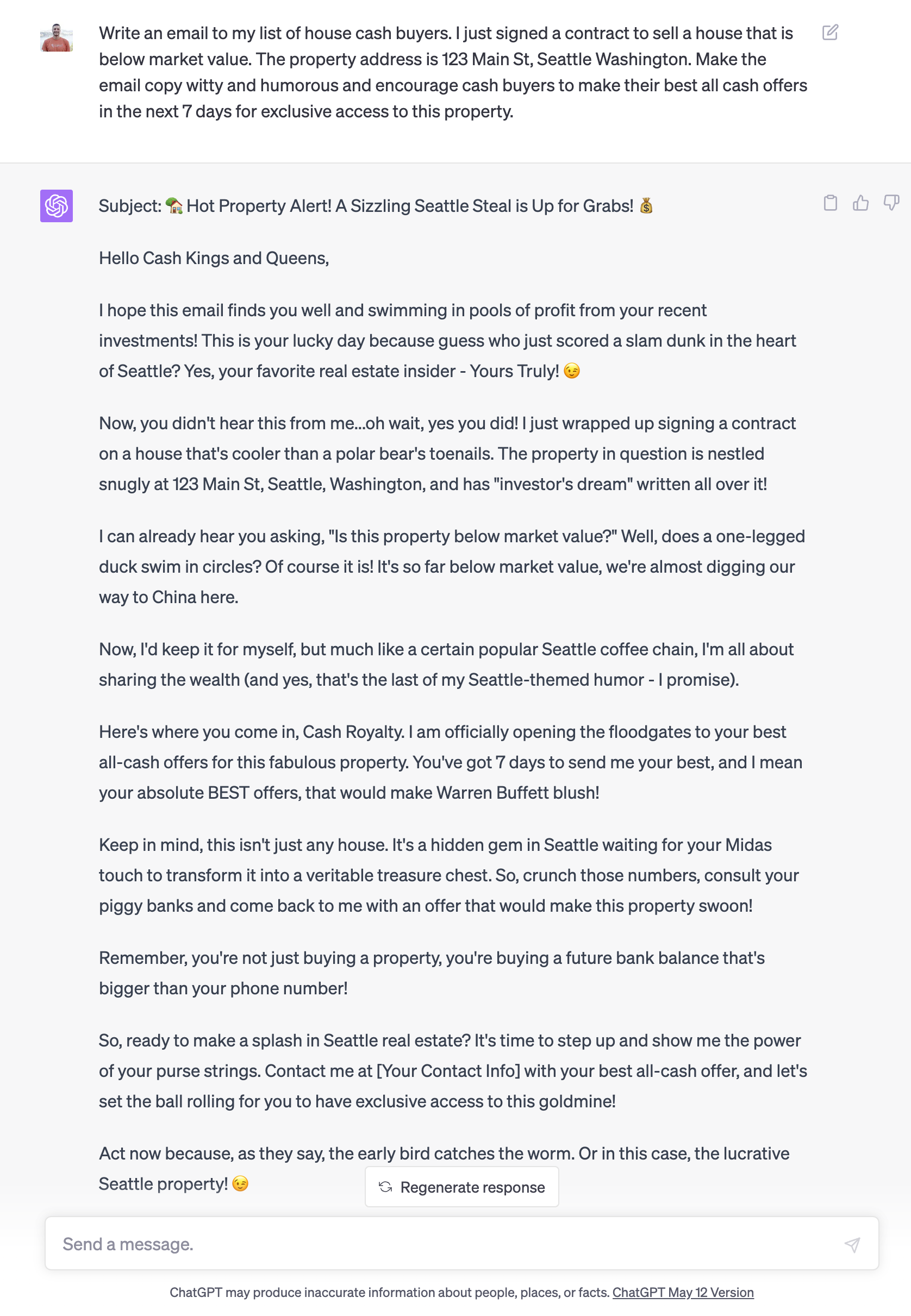 موجه: اكتب بريدًا إلكترونيًا إلى قائمة مشتري المنزل النقدي. لقد وقعت للتو عقدًا لبيع منزل أقل من القيمة السوقية. عنوان العقار هو 123 Main St، Seattle Washington. اجعل نسخة البريد الإلكتروني ذكية وروح الدعابة وشجع المشترين النقديين على تقديم أفضل عروضهم النقدية في الأيام السبعة المقبلة للوصول الحصري إلى هذا العقار.
