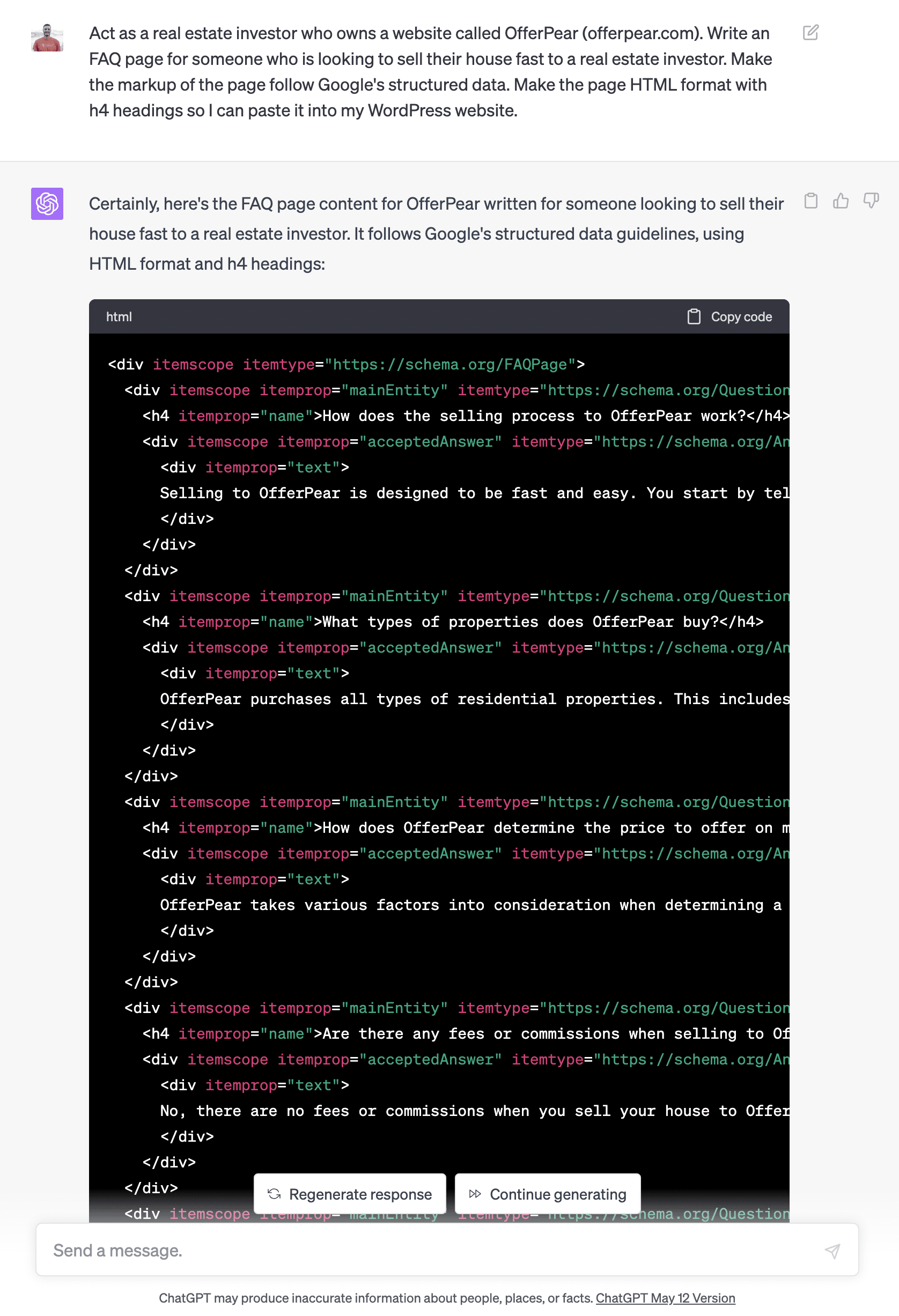 يتيح لك استخدام ChatGPT إنشاء صفحات بنمط الأسئلة الشائعة باستخدام الموجه التالي بسرعة. أفضل جزء؟ يمكنك طلب بيانات Google المهيكلة التي يبحث عنها Google عادةً عند إنشاء مقتطفات مميزة في نتائج البحث.