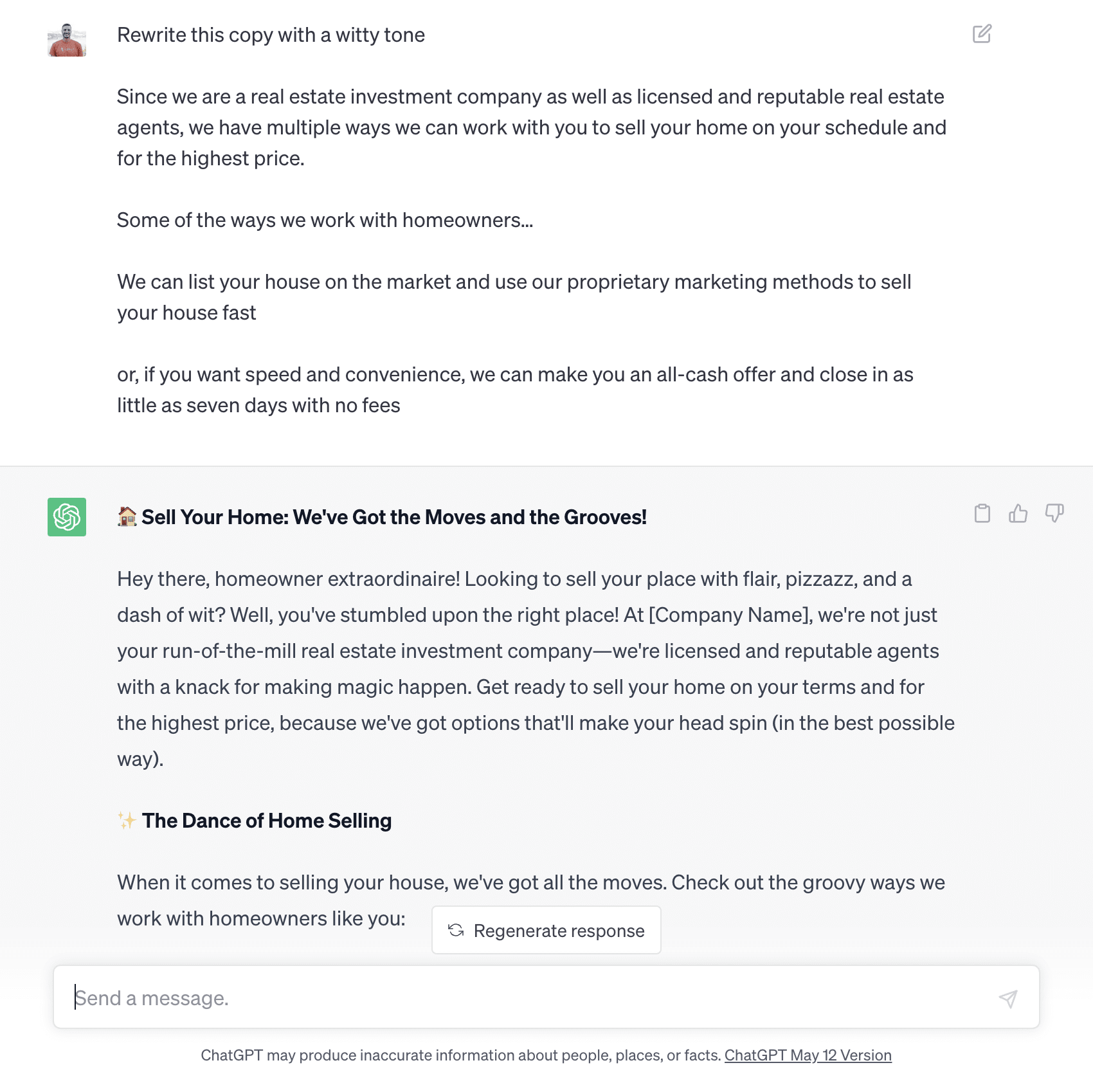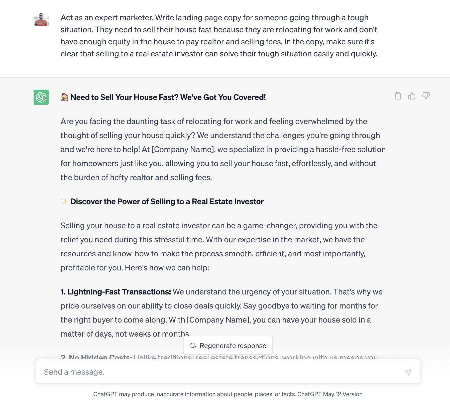 تعد مجموعة المطالبات أدناه نقطة انطلاق رائعة. نشجعك على تعديلها قليلاً بناءً على علامتك التجارية وموقعك والمشاكل التي تريد تثقيف عملائك بشأنها. إذا كنت ترغب في التركيز على حبس الرهن أو المنازل التي غمرتها المياه ، يمكن للذكاء الاصطناعي أن يساعدك في إخباره بما تحتاجه.