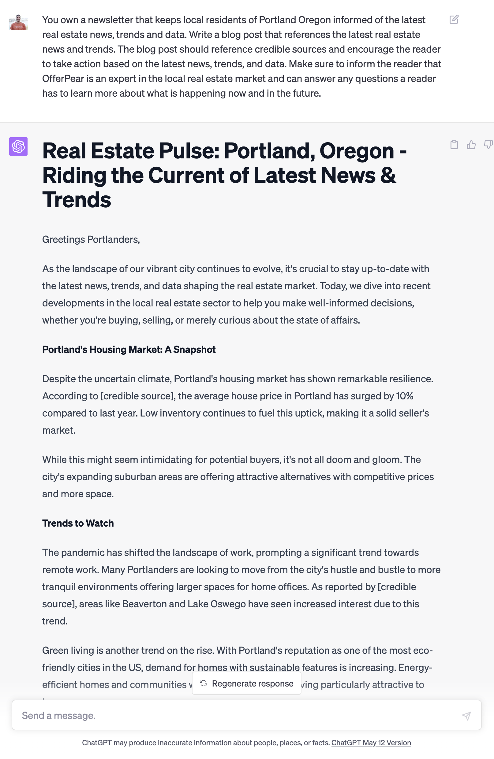 موجه : أنت تمتلك نشرة إخبارية تُطلع السكان المحليين في بورتلاند أوريغون على آخر أخبار واتجاهات وبيانات العقارات. اكتب منشور مدونة يشير إلى آخر أخبار واتجاهات العقارات. يجب أن يشير منشور المدونة إلى مصادر موثوقة وأن يشجع القارئ على اتخاذ إجراء بناءً على أحدث الأخبار والاتجاهات والبيانات. تأكد من إبلاغ القارئ بأن OfferPear خبير في سوق العقارات المحلي ويمكنه الإجابة على أي أسئلة يجب على القارئ معرفة المزيد حول ما يحدث الآن وفي المستقبل.