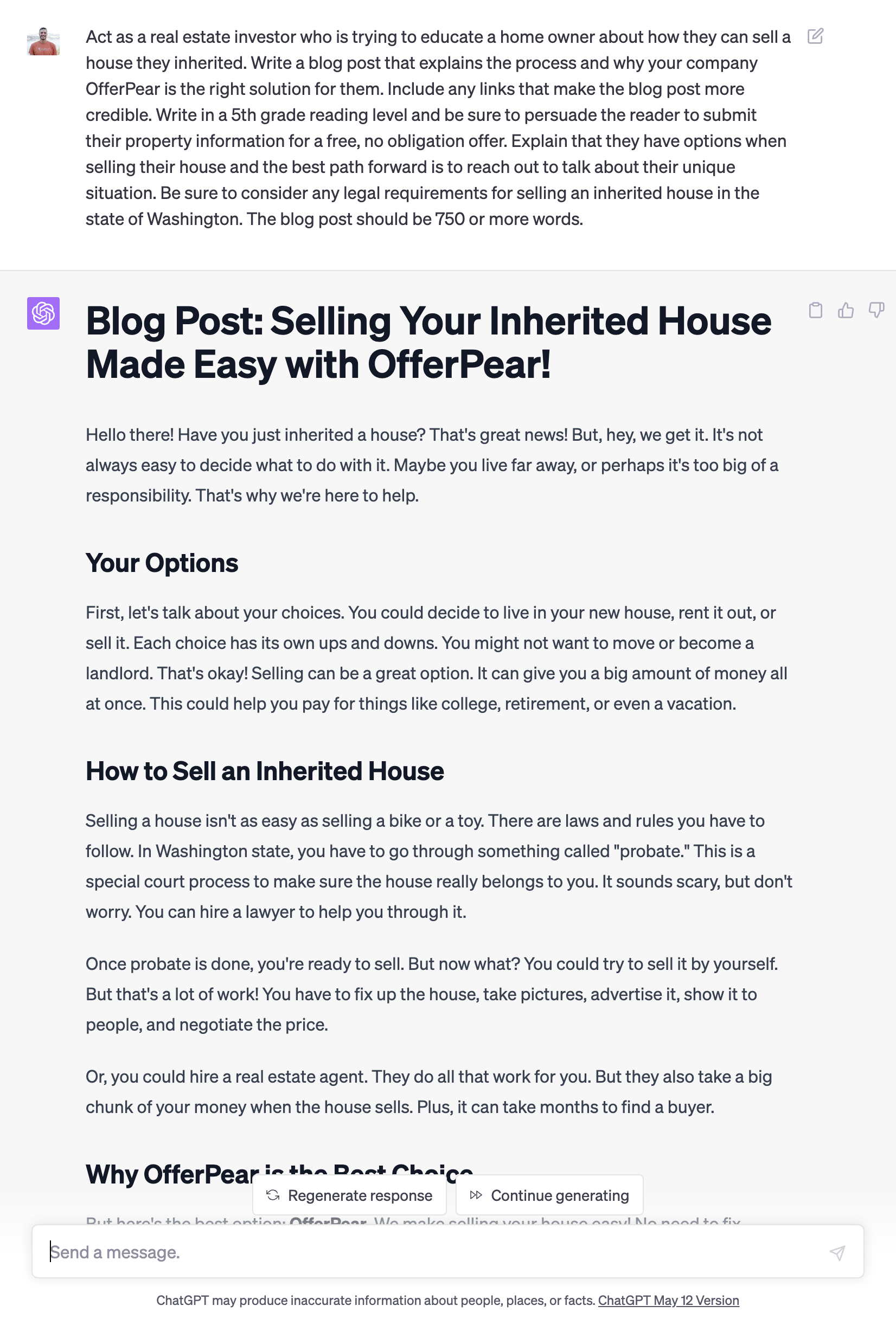 موجه : العمل كمستثمر عقاري يحاول تثقيف صاحب المنزل حول كيفية بيع منزل ورثه. اكتب منشور مدونة يشرح العملية ولماذا تعد شركة OfferPear هي الحل المناسب لهم. قم بتضمين أي روابط تجعل منشور المدونة أكثر مصداقية. اكتب في مستوى القراءة بالصف الخامس وتأكد من إقناع القارئ بإرسال معلومات ممتلكاته للحصول على عرض مجاني غير ملزم. اشرح لهم أن لديهم خيارات عند بيع منزلهم وأن أفضل طريق للمضي قدمًا هو التواصل للحديث عن وضعهم الفريد. تأكد من مراعاة أي متطلبات قانونية لبيع منزل موروث في ولاية واشنطن. يجب أن تكون مشاركة المدونة 750 كلمة أو أكثر.
