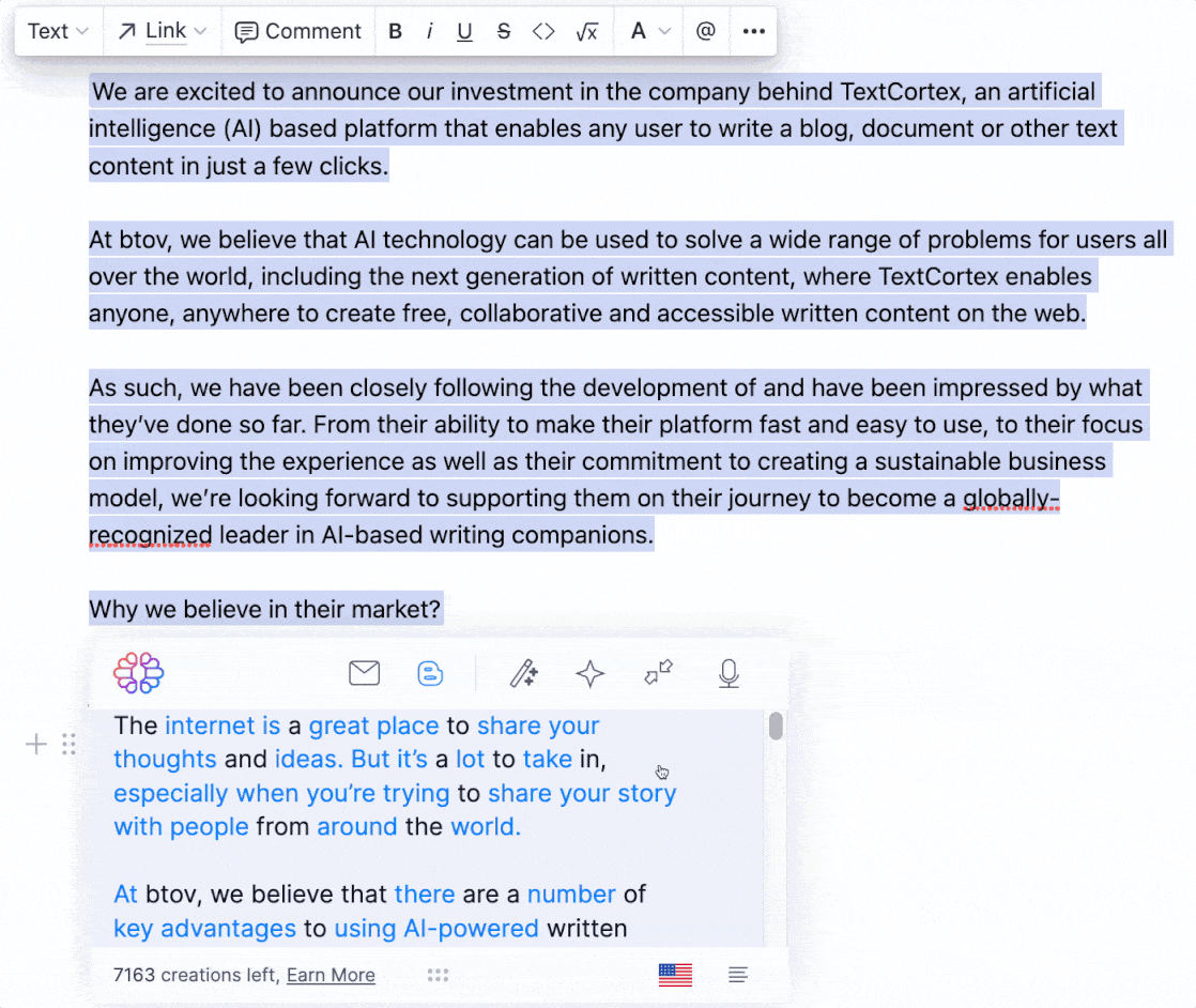 تنضم TextCortex إلى المجال للبحث ، وبناء وتطوير مستقبل تكنولوجيا NLG من أساسياتها في أقرب وقت ممكن للمستخدمين المحتملين من خلال شبكتنا من نماذج اللغة المضبوطة التي تسمى NeoCortex.