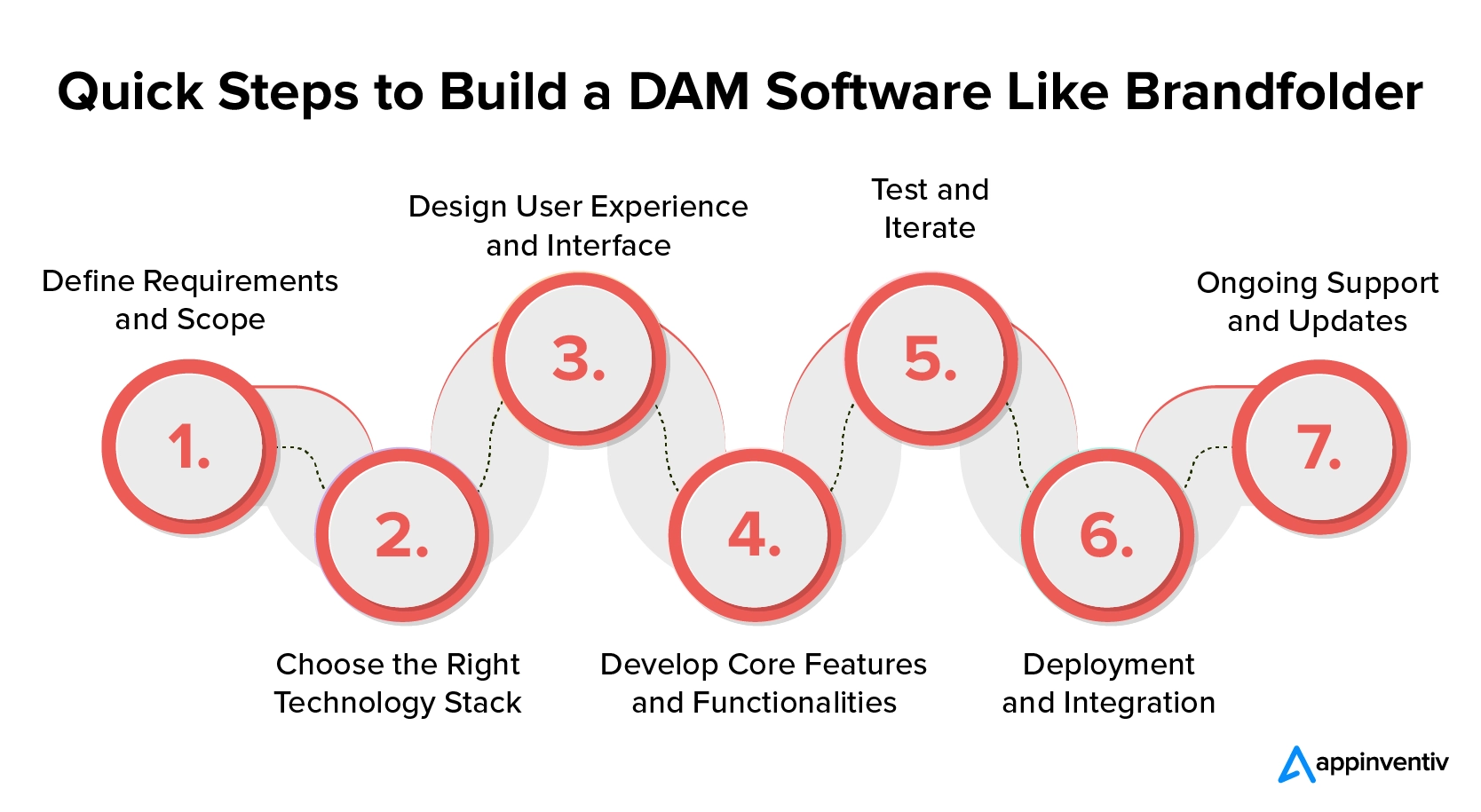 يتطلب تطوير برنامج DAM مثل Brandfolder تخطيطًا دقيقًا وتنفيذًا استراتيجيًا. يتضمن مراحل مختلفة، كل منها حاسمة لضمان أن المنتج النهائي يلبي احتياجات العمل. فيما يلي خطوات عملية تطوير برنامج DAM.