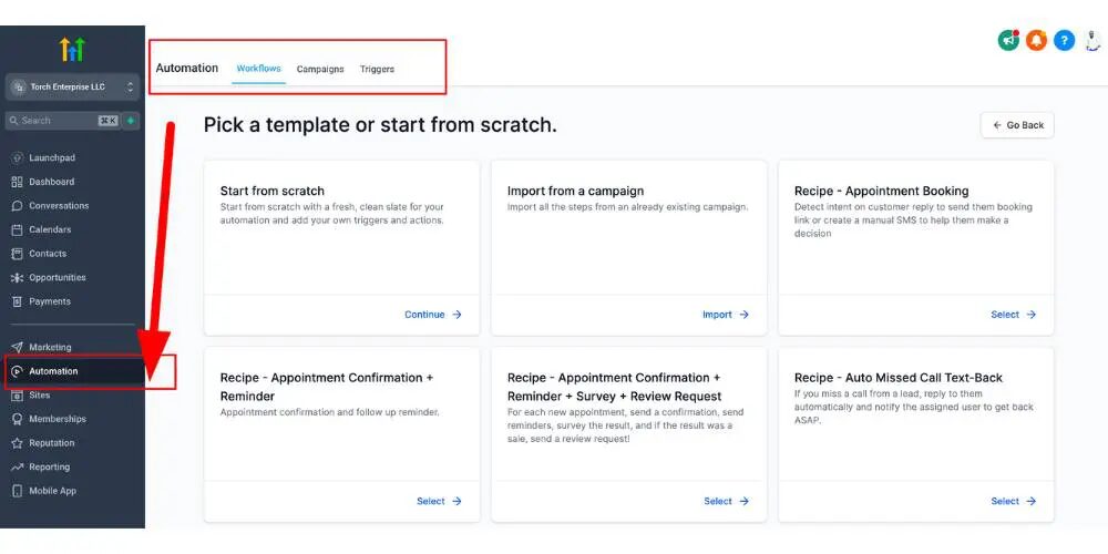 - المتابعة الآلية: استخدم ميزات الأتمتة الخاصة بـ Gohighlevel لإعداد تسلسلات متابعة تلقائية، بما في ذلك حملات البريد الإلكتروني والرسائل النصية القصيرة، لرعاية العملاء المحتملين وإشراك العملاء المحتملين ودعم أعضاء الفريق.