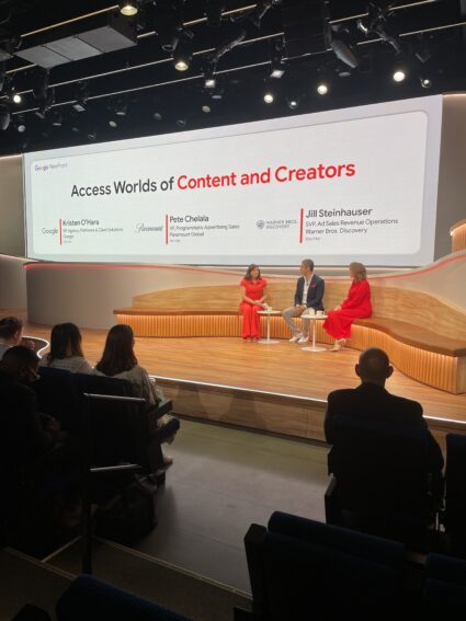 انضم نائب الرئيس الأول لمبيعات الإعلانات الآلية بيت شيلالا ونائب الرئيس الأول للاكتشاف في شركة Warner Bros. نائب الرئيس الأول لعمليات إيرادات مبيعات الإعلانات جيل ستاينهاوزر إلى نائب رئيس Google لحلول الوكالات وخدمات العملاء كريستين أوهارا على المسرح لمناقشة مستقبل حلول المحتوى المتكاملة من خلال عمليات تكامل الناشرين المتميزين الجديدة من Google . وناقشوا الفوائد التي يتطلع القائمون على البث المباشر للاستفادة منها من خلال هذه الشراكة الجديدة، بما في ذلك الوصول إلى الجمهور الآلي ونهج إعلامي ديناميكي موحد.
