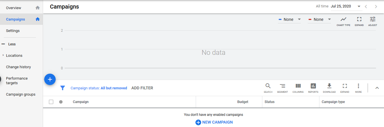 في القائمة الموجودة على الجانب الأيسر، افتح علامة التبويب "الحملة" . انقر على أيقونة "+" الزرقاء وحدد حملة جديدة.