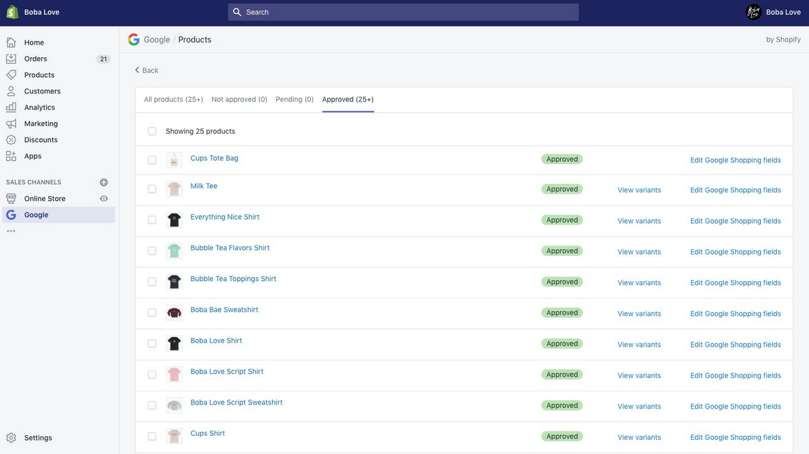 يعمل تطبيق Shopify بشكل مثالي مع خدمة Google Shopping. يسهل عليك إضافة جميع المنتجات الموجودة في متجرك إلى خلاصة المنتج.