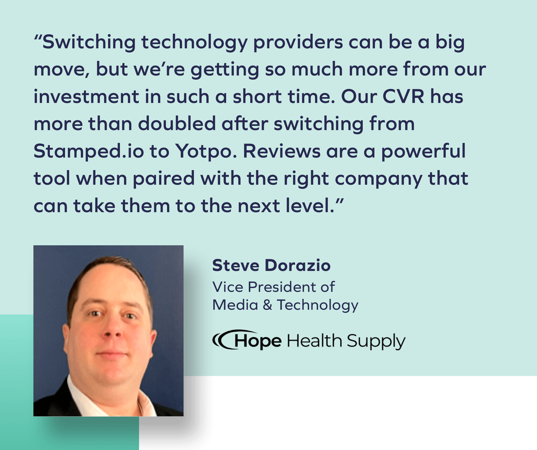 لكن لا تسمعها منا فقط. بمساعدة دعم CSM في Yotpo ، تقول Dorazio من Hope Health Supply ، "كان التنفيذ والإعداد مع Yotpo سهلًا وسلسًا للغاية." وتتابع دورازيو قائلة إن فريق نجاح العملاء لدينا "جعل الانتقال من Stamped.io إلى Yotpo سلسًا وسهلًا قدر الإمكان. نحن شركة مملوكة لعائلة ، وقد منحنا Yotpo معنا في كل خطوة على الطريق إحساسًا بالأمان نفخر بأنفسنا لمنحه لعملائنا ".
