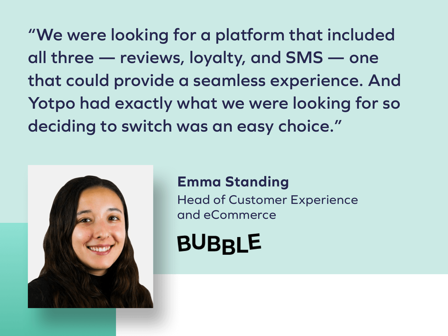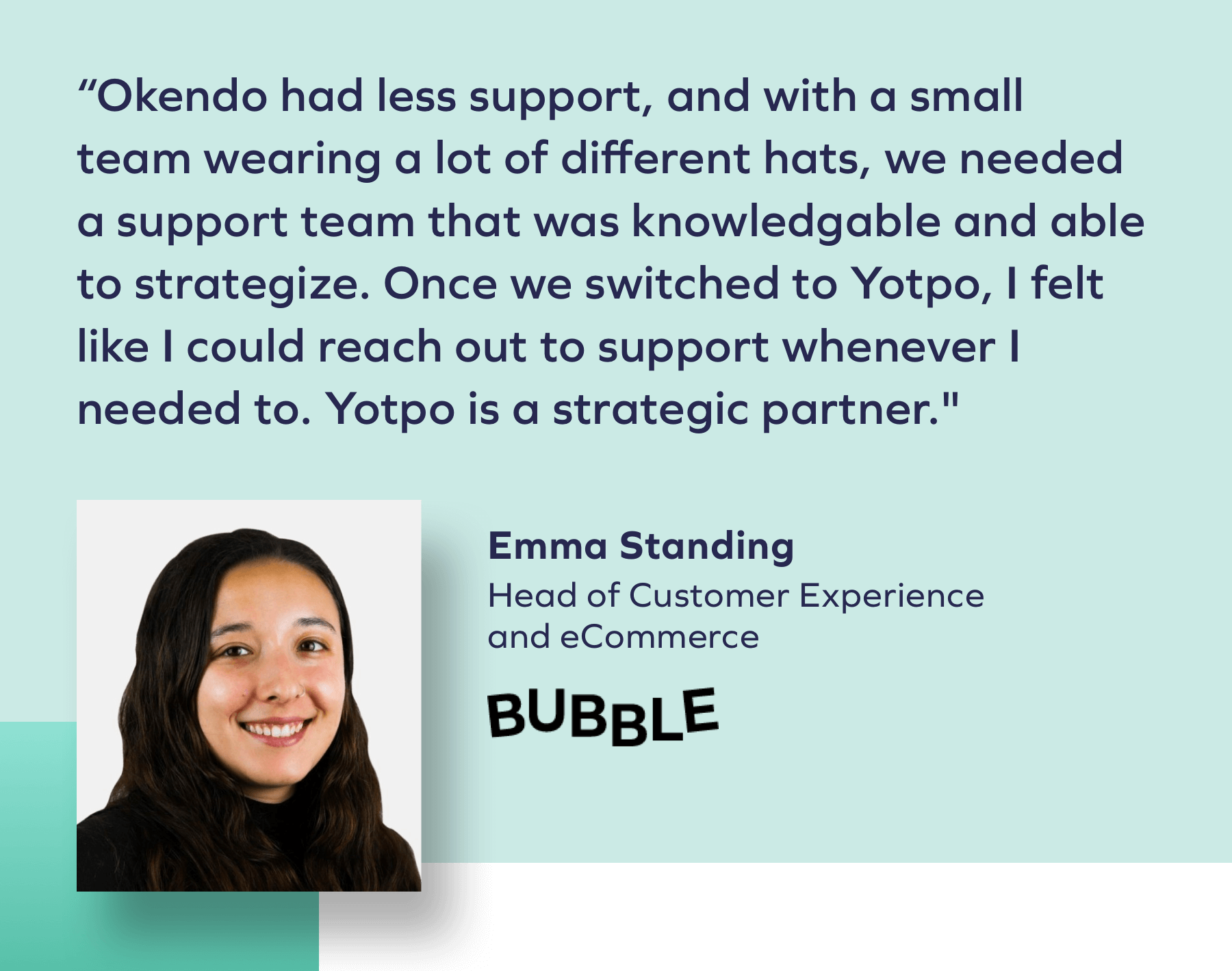 إذا كنت تبحث عن أقصى قدر من النتائج ، فلا يمكن المبالغة في تقدير قيمة فريق نجاح العميل. في الواقع ، عند تقييم خياراتهم ، كان أحد الأهداف العديدة لعلامة Bubble التجارية للعناية بالبشرة هو العمل مع مدير نجاح عملاء مخصص يمكنهم الاتصال به كلما دعت الحاجة. من خلال الشراكة مع Yotpo for Reviews ، تم إقرانهم بفريق دعم استباقي يتحقق بانتظام من تقدمهم. عند البحث عن المزود المناسب لعلامتك التجارية ، تأكد من فهم نوع الخدمات المقدمة من حيث الدعم والاستثمارات في نجاح العملاء.