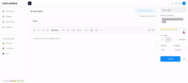 لصياغة مخرجات إبداعية وخالية من الانتحال ، يعتمد كتاب الذكاء الاصطناعي في TextCortex على أكثر من 3 مليارات من أفضل ممارسات حالة الاستخدام من قاعدة المعرفة الخاصة بنا.
