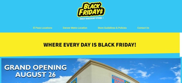 الجمعة السوداء هو عمل تصفية حديث. لديهم 5 منافذ ، واحد في كولورادو. علاوة على ذلك ، لديهم سياسة مثيرة للغاية تتمثل في إعادة تخزين مخزونهم كل يوم جمعة.