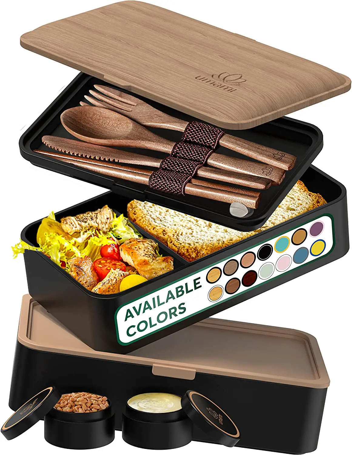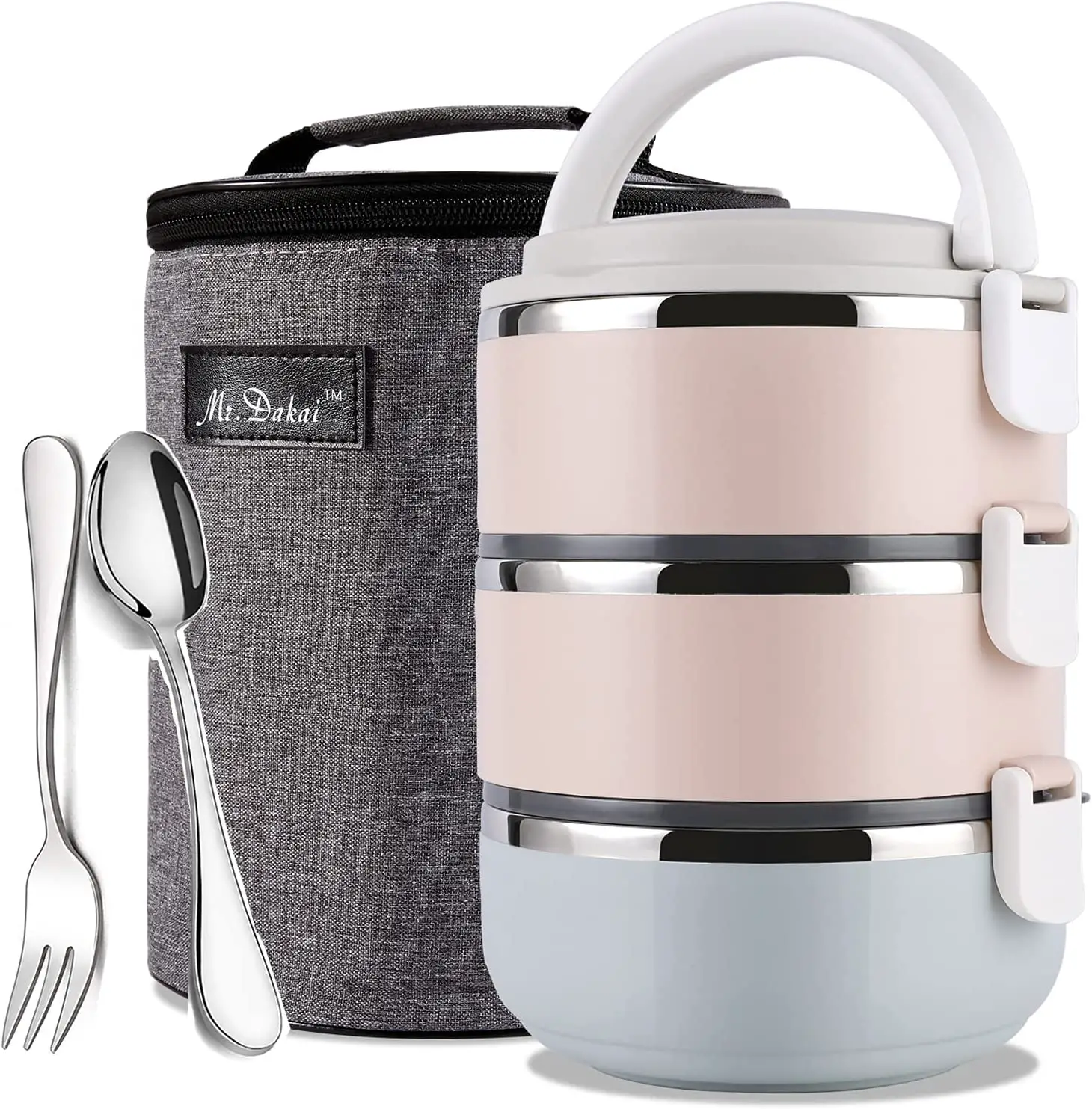 تصميم مستوحى من صندوق بينتو الياباني مع حاويات من 3 طبقات قابلة للتكديس. تحتوي كل طبقة على غطاء منفصل مع حلقة سيليكون محكمة الغلق لمنع التسرب.
