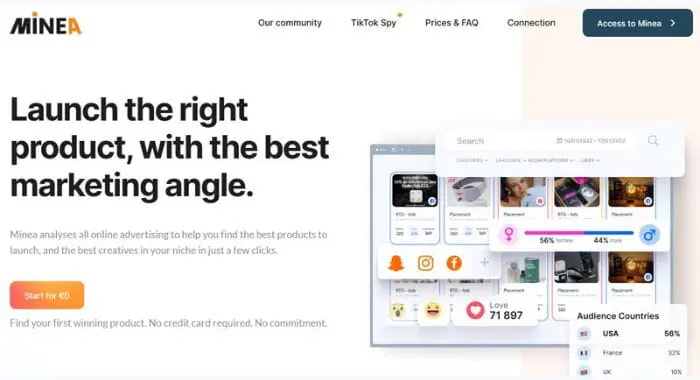 Minea هي أداة شاملة ساعدت في إنقاذك من هذه العملية الصارمة. تعمل Minea مع Facebook وInstagram وTikTok وPinterest وSnapchat.