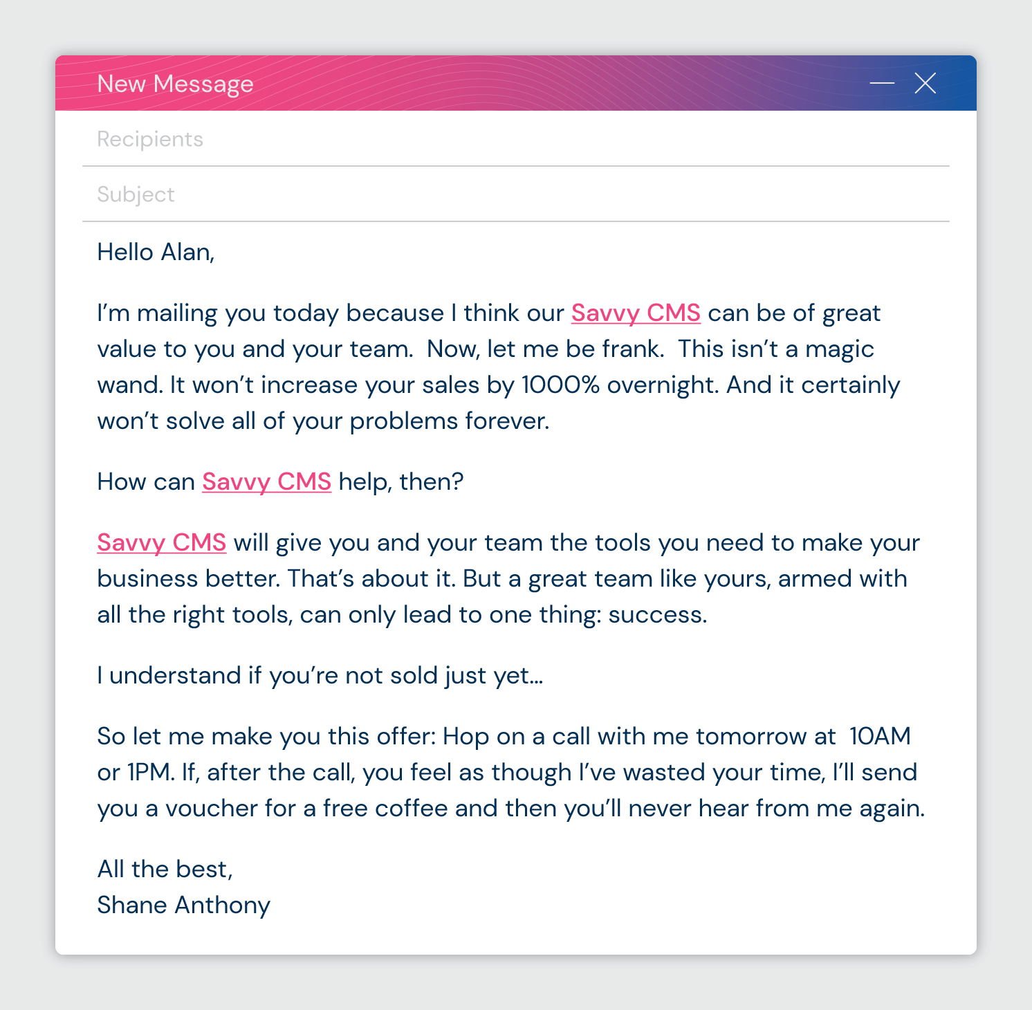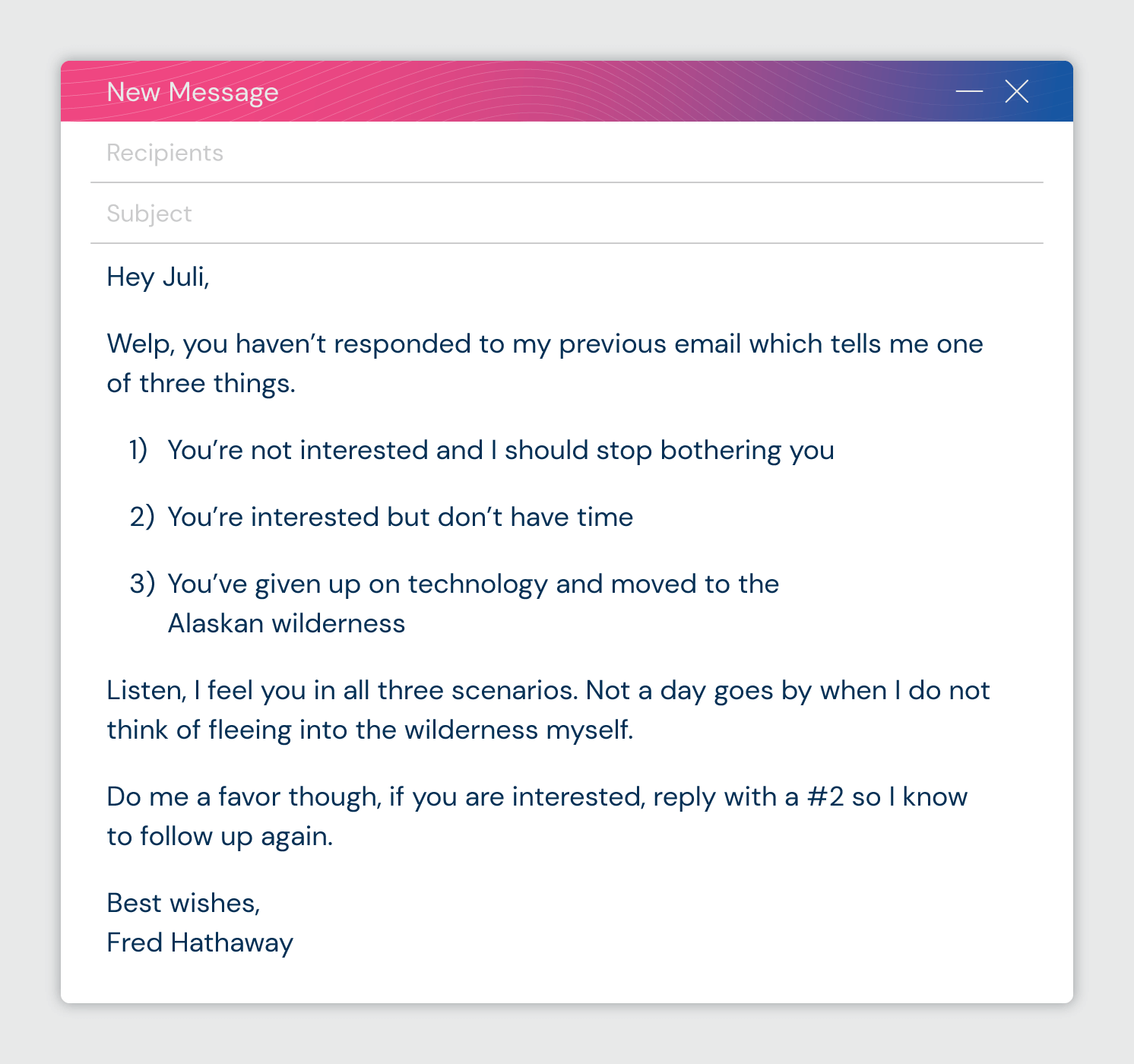 لماذا يعمل: هذا البريد الإلكتروني هو مثال ممتاز على كيفية استخدام الفكاهة للحفاظ على اسمك في الجزء العلوي من صندوق الوارد الخاص بالاحتمالات. إنه يمنح المستلم القليل من الراحة الكوميدية في يوم عملهم بينما لا يزال يذكرهم بأن لديك منتجًا رائعًا يمكن أن يساعدهم في حل مشكلة ما.