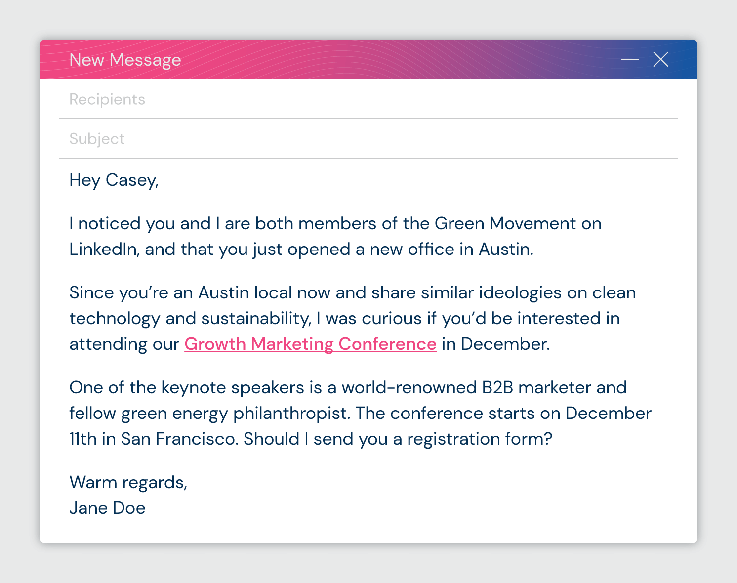 مرحبًا {{Name}} ، لقد لاحظت أنك وأنا عضوان في {Common connection} على LinkedIn ، وأنك فتحت للتو مكتبًا جديدًا في {City}. نظرًا لأنك مواطن محلي الآن وتشترك في أيديولوجيات مماثلة حول التكنولوجيا النظيفة والاستدامة ، فقد شعرت بالفضول إذا كنت مهتمًا بحضور {المؤتمر} في ديسمبر. أحد المتحدثين الرئيسيين هو خبير مشهور عالميًا في {الصناعة}. يبدأ المؤتمر في 11 كانون الأول (ديسمبر) في {City}. هل يجب أن أرسل لك استمارة التسجيل؟ تحياتي الحارة ، {{التوقيع}} قم بتنزيل هذا النموذج |