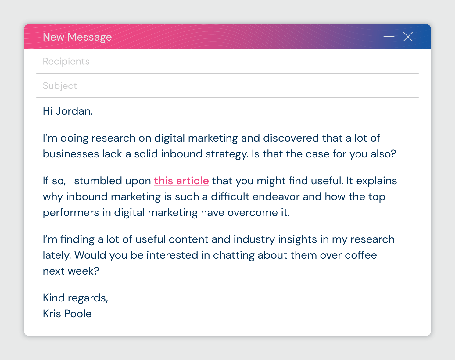 مستوحى من Gabriel Swain من لماذا يعمل: إرسال محتوى ذي صلة من مدونتك أو شركات الأبحاث الصناعية أو حتى مجرد توصيات كتابية يمكن أن يقطع شوطًا طويلاً نحو بناء علاقة والاستفادة من مبدأ المعاملة بالمثل. يعمل قالب البريد الإلكتروني للمبيعات هذا بشكل أفضل إذا قمت بإقرانه بمحتوى ذي صلة وعالي الجودة يكون إما مثيرًا للاهتمام أو يعلمهم شيئًا مفيدًا أو كلاهما. كما أن مشاركة المحتوى تجعل المتابعة سهلة حيث يمكنك طلب أفكارهم حول هذا المحتوى.