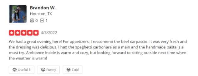 التسويق عبر الشهادات هو شكل من أشكال الإثبات الاجتماعي الذي يساعد العلامات التجارية على بناء الثقة والوعي بالعلامة التجارية. ضع في اعتبارك مراجعة Yelp هذه لـ Da Andrea في نيويورك ، نيويورك.