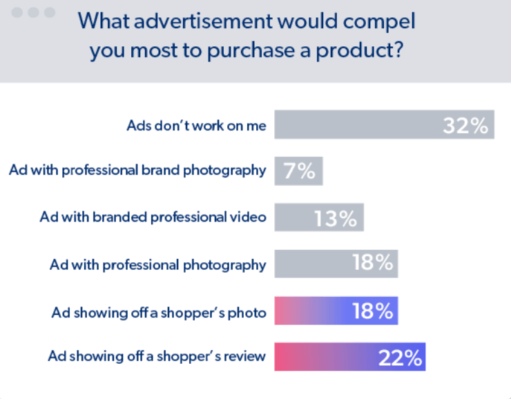 تُظهر الشهادات لجمهورك الدليل الاجتماعي الذي يحتاجون إليه للثقة بعلامتك التجارية. على الرغم من أن معظم الأشخاص لا يثقون في الإعلانات بشكل عام ، فمن المرجح أن يشتري 22٪ من المتسوقين منتجًا إذا رأوا إعلانًا يتضمن شهادة من العميل. لهذا السبب يعتبر التسويق القائم على الشهادات أمرًا حيويًا للتجارة الإلكترونية - فهو يساعد العلامات التجارية على بناء جمهور موثوق به.