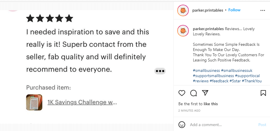 عندما تكون التقييمات جيدة ، شاركها على Instagram. يمكن أن تعزز منشورات Instagram ، بما في ذلك التقييمات من موقع الويب الخاص بك ، تلك الشهادات وتصل إلى جمهور أوسع ، خاصة إذا كنت تستخدم علامات التصنيف. نشرت Parker Printables لقطات من شهادات العملاء وتقييماتهم على Instagram.