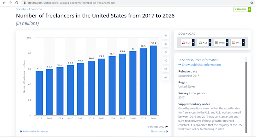 أظهر استطلاع عام 2017 أنه بحلول عام 2027 ، سيشكل المستقلون ما يصل إلى 50٪ من القوى العاملة في الولايات المتحدة ، ومع النزوح الذي تسبب فيه الوباء العالمي ، لا بد أن يبحث المزيد من الأشخاص عن وظائف الكتابة المستقلة.