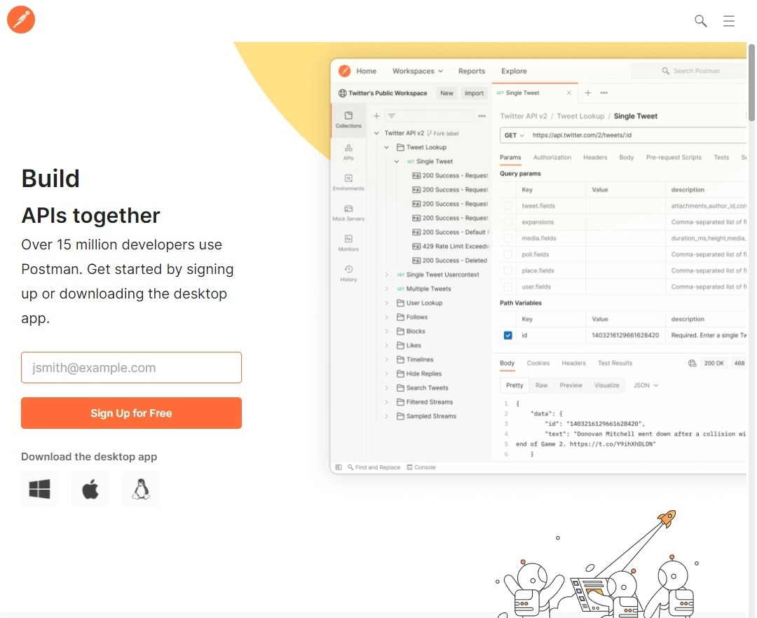 Postman عبارة عن نظام أساسي لواجهة برمجة التطبيقات (API) للبناء باستخدام واجهات برمجة التطبيقات مع ميزات تتمحور حول تبسيط العملية وتبسيط تعاون الفريق. مع Postman ، سوف تكون قادرًا على حل المشكلات بشكل أسرع من أي وقت مضى لأنه يعد بأوقات تطوير أسرع 5 مرات ، وإصلاحات أسرع للأخطاء بمقدار 4 مرات مما يعني قضاء وقت أقل في مهام العمل الشاقة مثل الاستجابة ذهابًا وإيابًا بين المطورين ؛ كل هذا يأتي معًا فيما يقول البعض أنه يمكن أن يصل إلى 10x كفرق فعالة. يمتلك Postman أدوات سلسة تمر عبر كل مرحلة من مراحل دورة حياة API. من التصميم إلى الاختبار والنشر حتى الصيانة أو الإيقاف ، يجعل منهج Postman المتكامل الأمر أسهل من أي وقت مضى.
