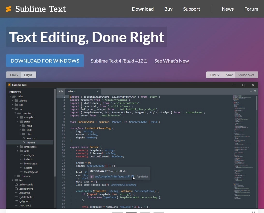 Sublime Text هو محرر نصوص رائع لأولئك الذين يرغبون في التحرير في بيئة سهلة الاستخدام ، ولكن ليست معقدة للغاية. لا يحتوي على جميع الميزات المتقدمة التي تقدمها الحلول الأخرى ولا يوجد العديد من الاختصارات (والتي قد تكون جيدة أو سيئة حسب تفضيلاتك). لكن ما تعوضه Sublime مع جمال التصميم ومدى بساطة كل شيء. لهذا السبب في قائمتنا! تعد ميزة الإكمال التلقائي الواعية للسياق بمثابة هبة من السماء للمبرمجين. يقترح رمزًا بناءً على ما كتبته حتى الآن ويوفر الوقت الذي تقضيه في كتابة نفس الشيء بشكل متكرر مرة أخرى! أضف واجهة برمجة تطبيقات Python محدثة ، وتعريفات بناء الجملة ، وأوقات تحميل فائقة السرعة - كل الأشياء التي تجعل من الصعب تجاهل Sublime Text باعتباره خيارك الأول عندما يتعلق الأمر بتحديد برامج تحرير النصوص عبر الإنترنت.