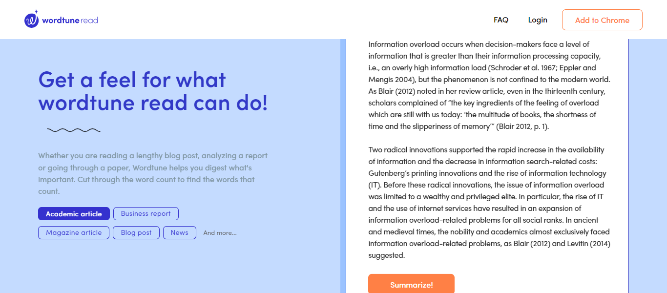 تعد قراءة Wordtune وسيلة رائعة لتوفير الوقت لأنها تلخص لك أجزاء نصية طويلة.