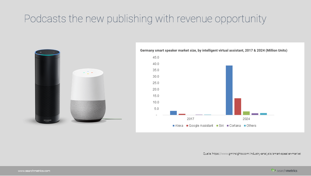 Podcasts haben ein großes Potenzial für die Vermarktung von Journalismus und den daraus resultierenden Inhalten. Besonders interessant ist in diesem Zusammenhang die Entwicklung von Smart Speakern. Amazons Assistent „Alexa“ ist bereits auf dem Vormarsch und gehört zum Alltag vieler Menschen. Es ist davon auszugehen, dass Inhalte irgendwann nur noch erfolgreich sein werden, wenn sie im Audioformat funktionieren. Es ist zu erwarten, dass Marketingstrategien in Zukunft entsprechend angepasst werden müssen.