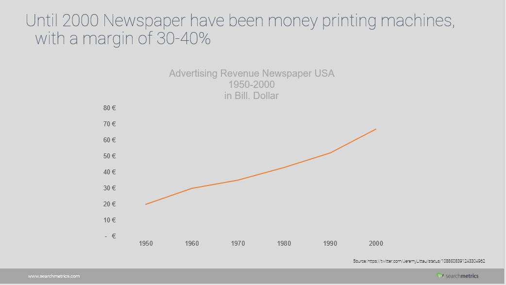 In der Vergangenheit hatten Verlage buchstäblich eine Lizenz zum Gelddrucken, mit einer Gewinnmarge von 30-40 % und Millionenumsätzen. Der Verkauf war für die Zeitungen nur eine Nebeneinnahmequelle. Tatsächlich waren Anzeigen von Drittanbietern die eigentliche Einnahmequelle. Durch die Zusammenarbeit mit Verlagen hofften sie, ein möglichst großes Publikum zu erreichen.