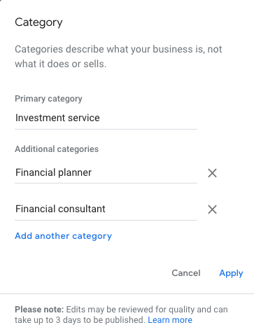 Google füllt diese Kategorien automatisch aus, sodass Sie keine eigenen erstellen können. Sie bieten jedoch viele spezifische Kategorien für die Finanzdienstleistungsbranche. Sie können aus Optionen wie „Finanzplaner“ und „Finanzberater“ und „Investmentservice“ wählen, um Ihre Arbeit zu beschreiben, und mehrere Kategorien sind zulässig.