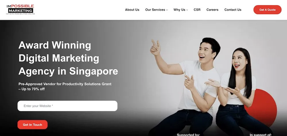 Impossible Marketing ist eine preisgekrönte Agentur für digitales Marketing mit Sitz in Singapur. Seit 2012 hilft Impossible Marketing lokalen Unternehmen dabei, das Unmögliche möglich zu machen. Sie haben über 1.000 großen und kleinen Marken dabei geholfen, ihre Online-Präsenz auszubauen und bieten verschiedene digitale Dienstleistungen an, darunter SEO, SEM, Lead-Generierung, Social-Media-Marketing und Videomarketing.