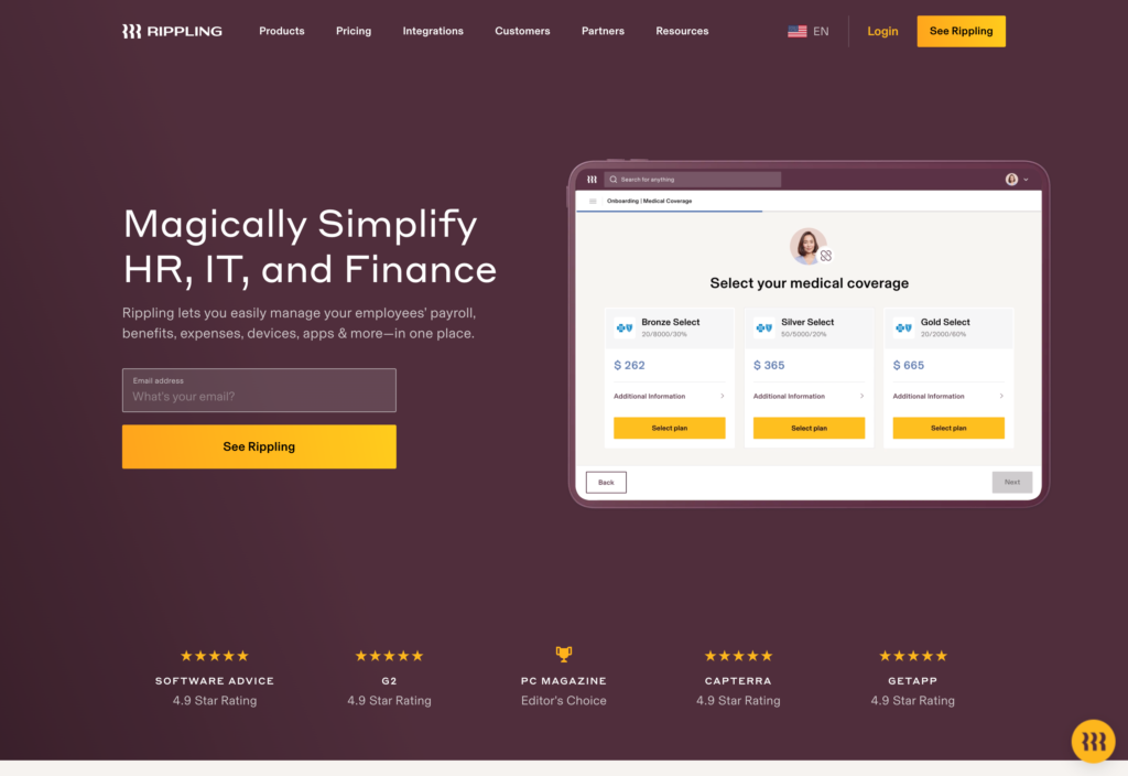 Rippling ist eine Workforce-Management-Plattform, die sich ideal für Startups eignet. Es verfügt über Lohn- und Gehaltsabrechnungs- und HR-Tools, ein Bewerberverfolgungssystem (ATS) und einen professionellen Arbeitgeberorganisationsdienst (PEO).