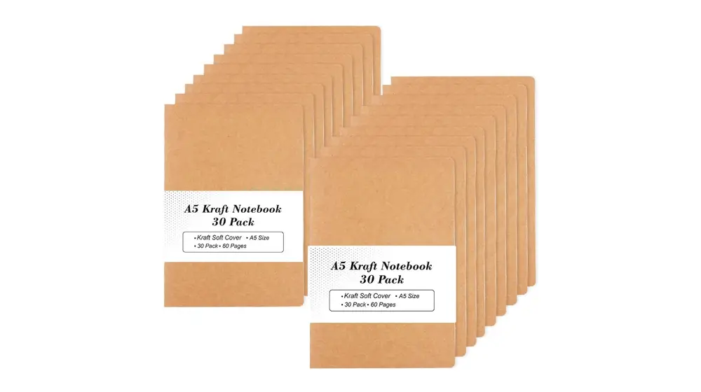 Zweiter Platz: Diese Packung mit 30 Kraft-Notizbüchern gehört zu den besten Optionen für große Notizbücher. Jedes Notizbuch misst 8,3″ x 5,5″, was klein genug ist, um es in eine Handtasche zu stecken, und groß genug, um darin zu schreiben und es festzuhalten.