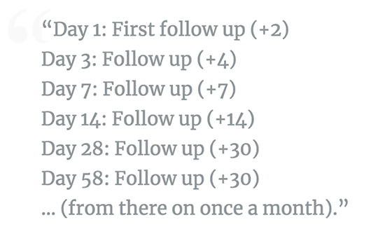 Um Ihren Follow-up-Erfolg zu maximieren, haben Sie konkrete „Regeln“ in Bezug auf Zeit, Häufigkeit, Menge und Botschaft. Sei konsequent. Und automatisieren.