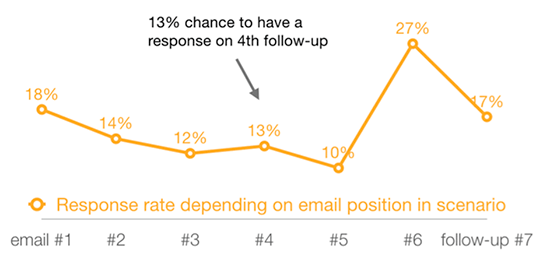 Darüber hinaus zeigen andere Studien, dass eine E-Mail-Drop-Serie mit 4-7 Nachrichten dreimal mehr Antworten liefert als solche mit nur 1-3 (27 % bzw. 9 %). Tatsächlich kann sogar eine einmalige Nachverfolgung 22 % mehr Antworten generieren.