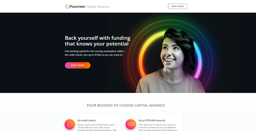 Capital Advance richtet sich an Verkäufer bei Amazon, Walmart und Wayfair. Unternehmen können bis zu 140 % ihrer monatlichen Marktplatzauszahlungen oder bis zu 750.000 $ erhalten. Alles, was Sie tun müssen, ist, Ihr Marktplatzkonto mit Payoneer zu verbinden. Die Plattform überprüft die Verkaufsleistung Ihres Shops und Payoneer erstellt Finanzierungsangebote für Sie.