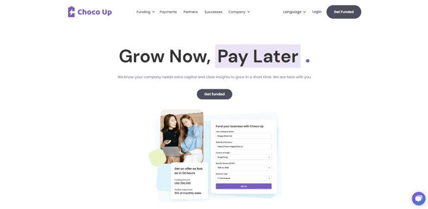 Choco-Up finanziert E-Commerce-Unternehmen. Unternehmen können leistungsabhängig gefördert werden. Sie können Ihr Konto mit Choco Up verbinden und es wird Ihre Daten verwenden, um Finanzierungsangebote zu berechnen.