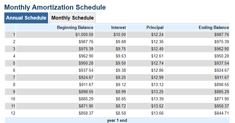 Kreditgeber können auch verschiedene Amortisationsmethoden anwenden. Diese Methoden verwenden spezifische Formeln, um den monatlichen Zahlungsbetrag zu berechnen und zu bestimmen, wie viel für Zinsen und Kapital gezahlt wird. Wenn wir uns den monatlichen Tilgungsplan ansehen, werden Sie feststellen, dass von der Zahlung in Höhe von 22,24 USD 10 USD auf die Zinsen und der Rest auf die Kapitalsumme angewendet werden.