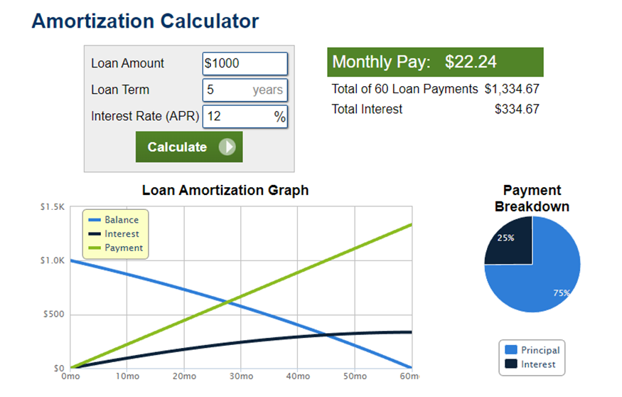Die Zinssätze für diese amortisierten Darlehen werden normalerweise als effektive Jahreszinsen (APR) ausgedrückt. Ein monatlicher Zinssatz von 1 % entspricht einem effektiven Jahreszins von 12 %. Ein 1.000-Dollar-Darlehen zu einem effektiven Jahreszins von 12 %, aber mit einer Laufzeit von 5 Jahren, hat einen Gesamtzins von 334,67 Dollar – weit entfernt von den 10 Dollar, die Sie zahlen müssen, wenn es nur für einen Monat ist. Aber da die monatliche Zahlung nur 22,24 $ beträgt, ist es verständlich, warum manche dies für ein recht attraktives Angebot halten.