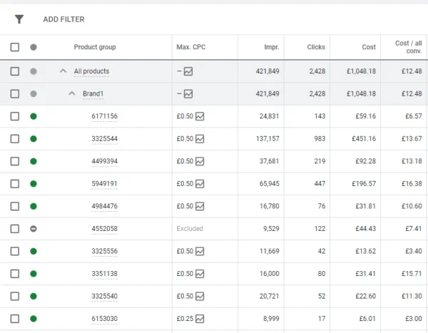 Je nach Wettbewerbsfähigkeit des Marktes und Preisgestaltung wird sich dies ändern. Wir verkaufen Produkte zwischen 200 und 500 £, die im Allgemeinen zwischen 10 und 20 anderen Unternehmen haben, die dieselben Produkte verkaufen. Wir können einen Anteil an möglichen Impressionen von 60 % und einen Anteil an Klicks von 30 % erzielen, indem wir unsere Gebote sorgfältig verwalten und sicherstellen, dass wir alle Produkte ausgeschlossen haben, für die wir keinen wettbewerbsfähigen Preis haben oder die nicht vorrätig sind.