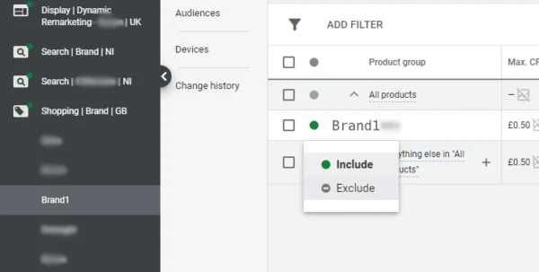 Die Top-Kampagne „Shopping | Marke | GB“ zielt auf Markensuchen in Großbritannien ab und schließt Nordirland aus. Die Kampagnenpriorität ist auf Mittel eingestellt. Diese Kampagne hat 4 Anzeigengruppen, eine für jede Produktmarke, die in der Google Shopping-Kampagne verkauft wird.