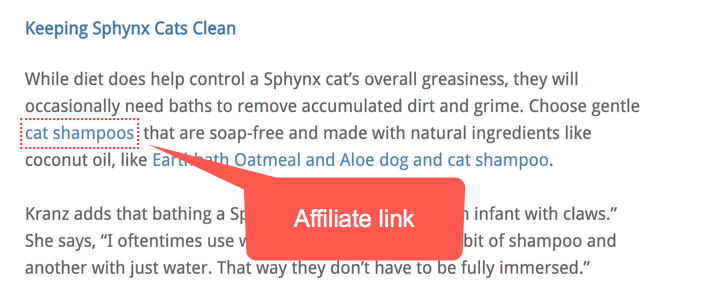 Auf einer anderen Website, die Drops für Sphynx-Katzenbezogene Keywords gesehen hat, können wir sehen, dass es Affiliate-Links gibt, die nicht als solche gekennzeichnet sind. Unsere nofollow Chrome-Erweiterung hat diesen Link aufgegriffen. Andernfalls kann ein Leser nicht erkennen, dass es sich bei diesem Link um eine Anzeige handelt.