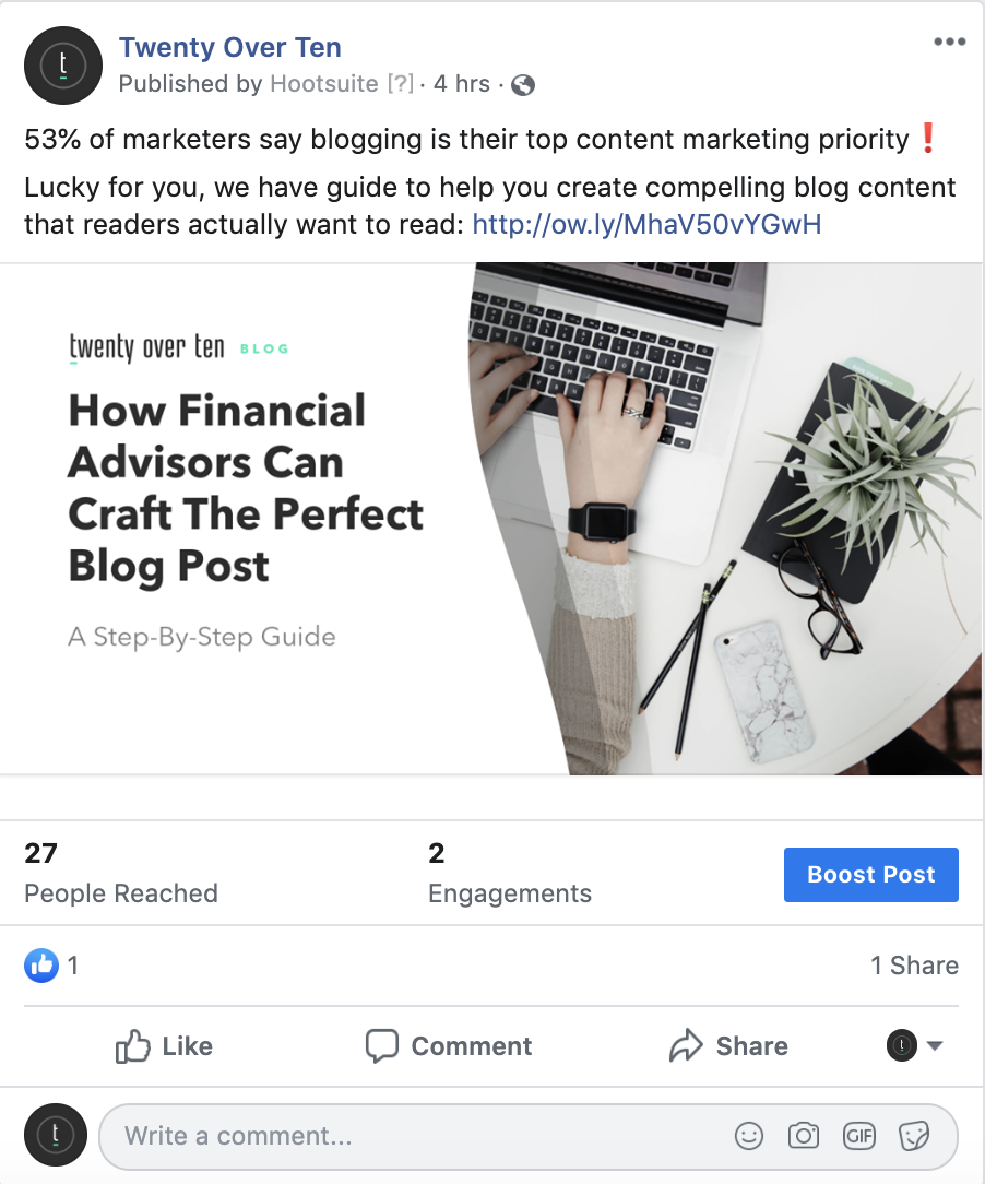 Im folgenden Beitrag haben wir einen Blog über das Erstellen des perfekten Blog-Beitrags geschrieben und ein Bild und einen Link auf unserer Facebook-Seite geteilt, um noch mehr Follower zu erreichen.